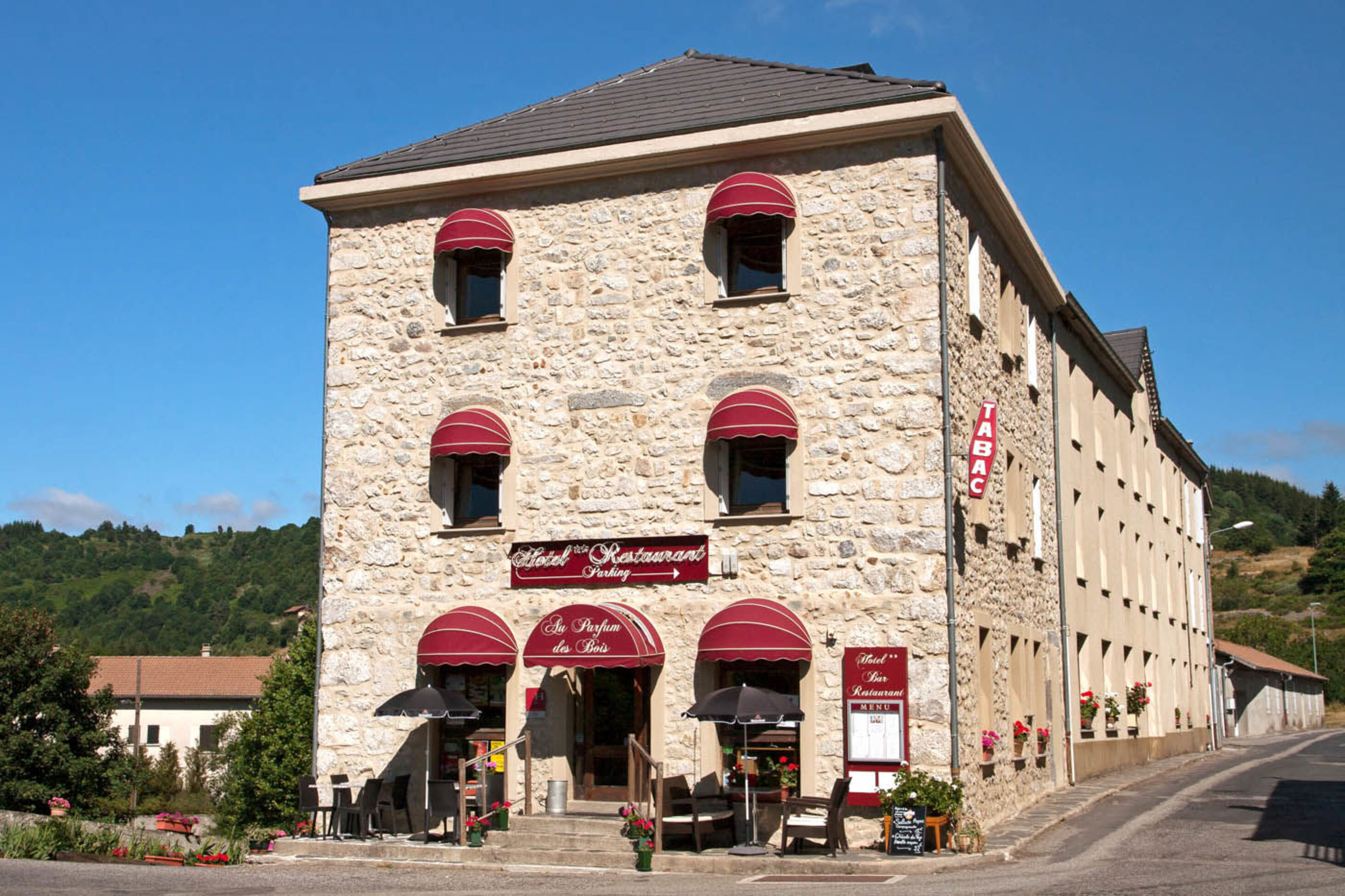 L’hôtel Restaurant “Au Parfum des Bois” est situé à Saint-Cirgues-en-Montagne en Ardèche (07) au bord de la rivière. Perché à 1044m d’altitude dans les montagnes ardéchoises, notre établissement vous procurera calme et sérénité, le tout dans une ambiance familiale.